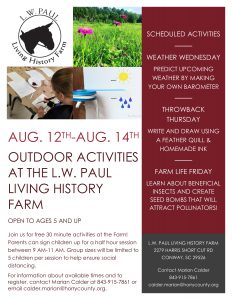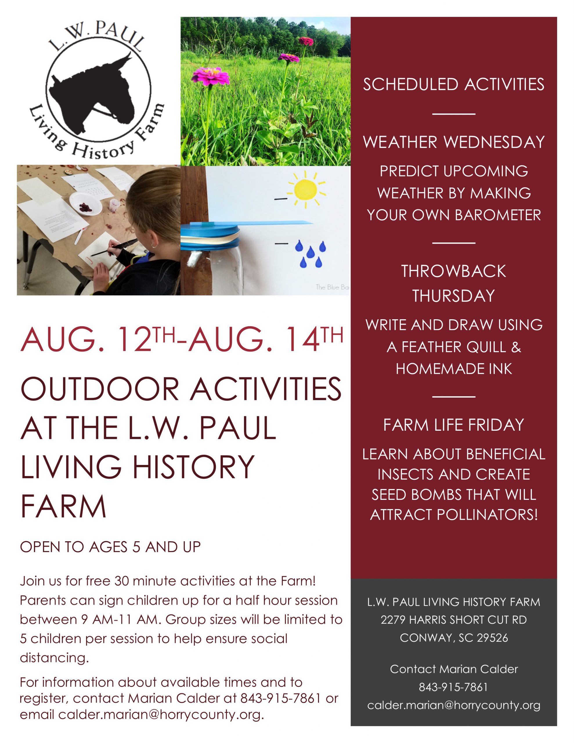Join us for free 30-minute activities at the Farm August 12th-August 14th! Parents can sign children up for a half-hour session between 9 AM-11 AM. Group sizes will be limited to 5 children per session to help ensure social distancing.  On Wednesday, children will learn how to predict upcoming weather by creating their own barometer. Thursday they’ll write and draw using a feather quill and homemade ink, and Friday, they will learn about beneficial insects and create seed bombs that will help attract local pollinators.